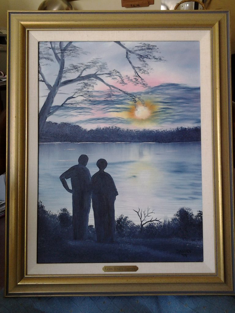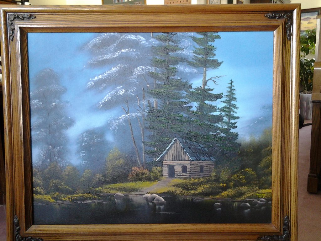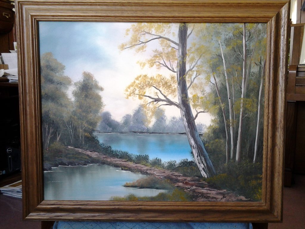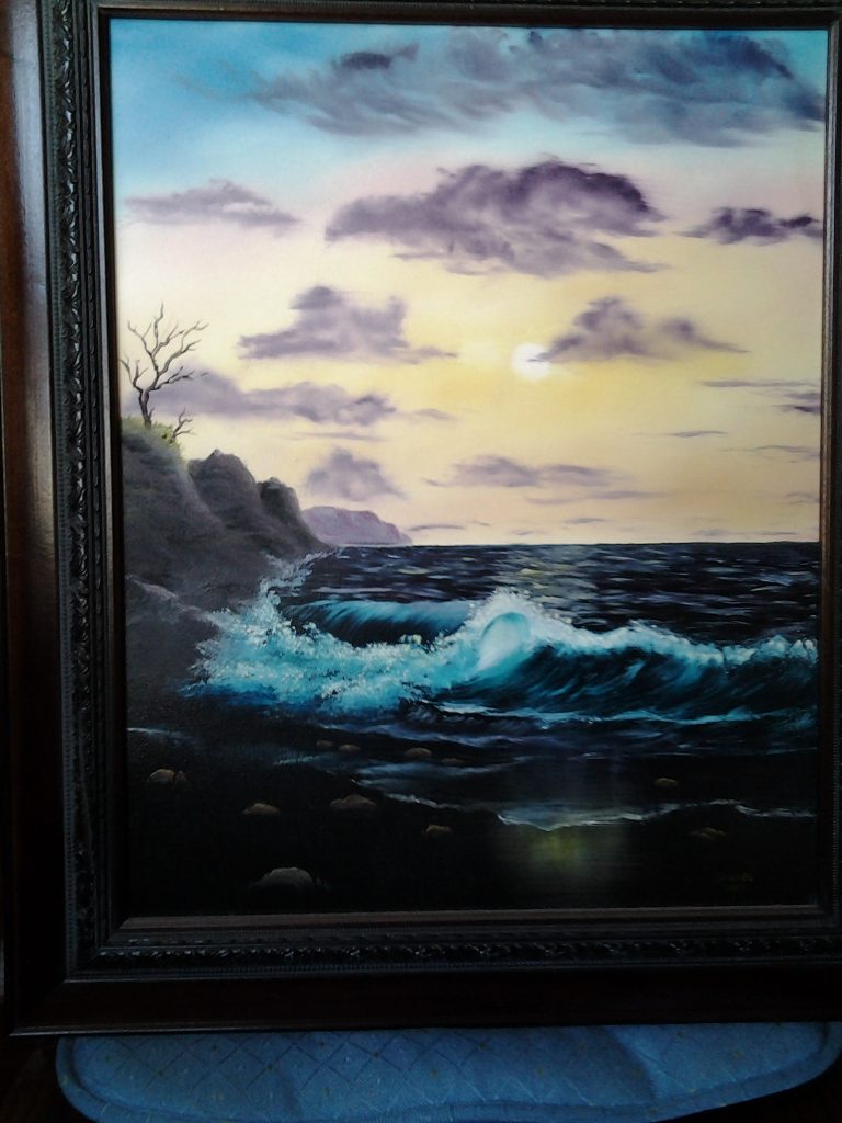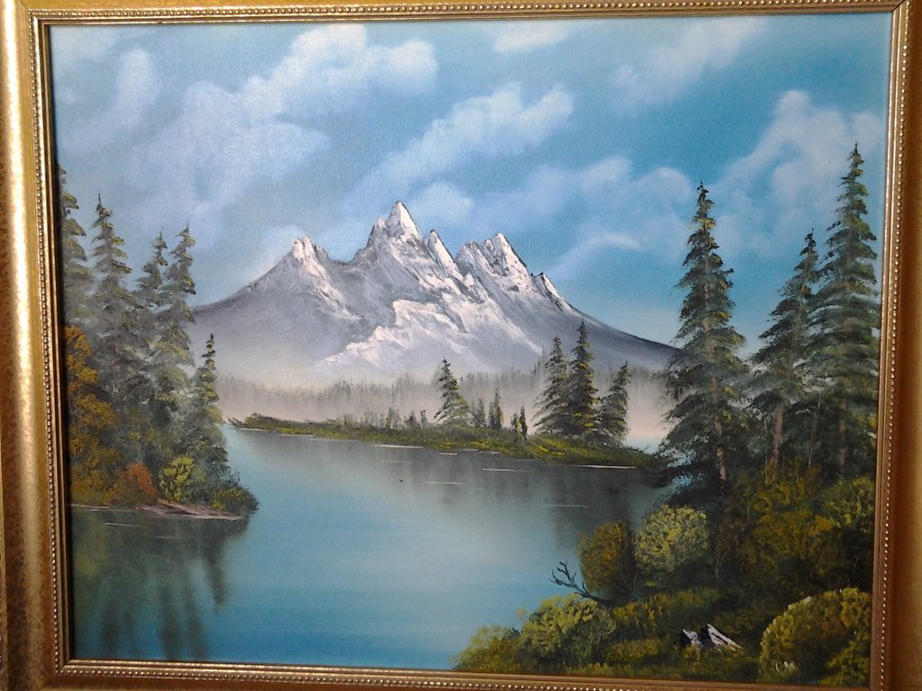 The first five oil paintings I did created from Bob Ross paintings (pictures or tutorials). The last one I used Bob Ross’s techniques in “Facing Sunsets Together” from a photo my parents gave me of them.